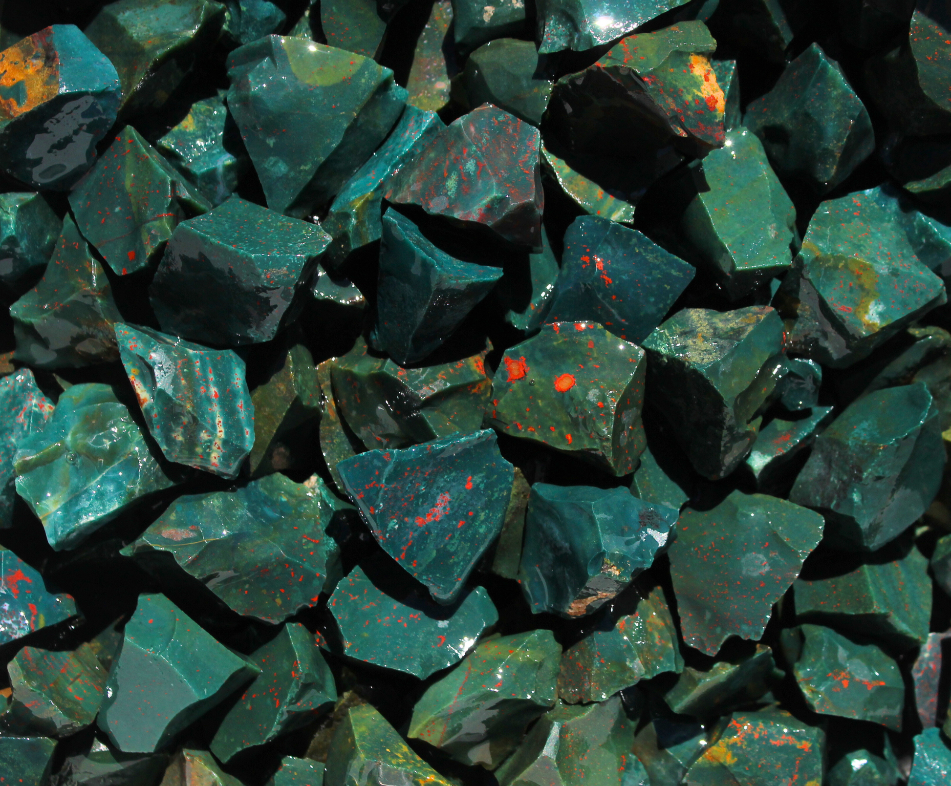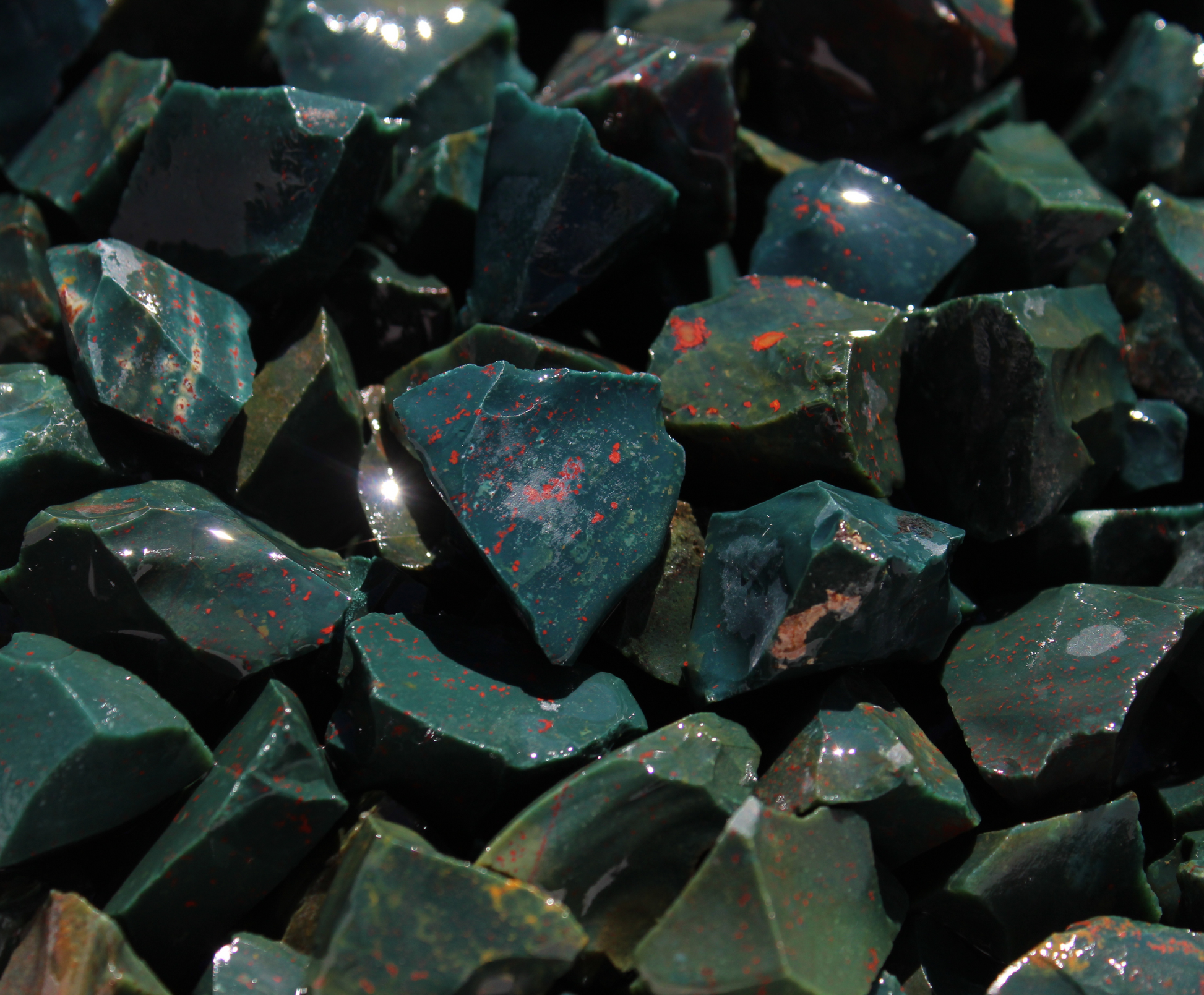 Use the drop-down to select either 1/2 Pound, 1 Pound or 3 Pounds of raw Bloodstone! "Bloodstone" is a trade name to describe the mineral Heliotrope or "Ematille" which is green jasper with red inclusions of hematite. This particular batch of Bloodstone has primarily Green Jasper with quartz "white spots" with trace amounts of the red hematite. These are "tumbling size", meaning they are around 1" - 2" and "chunky" to create a uniform final product from a rock tumbler.