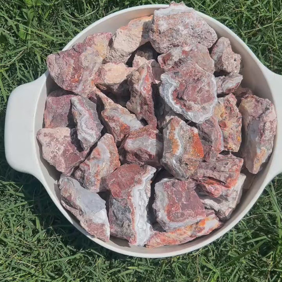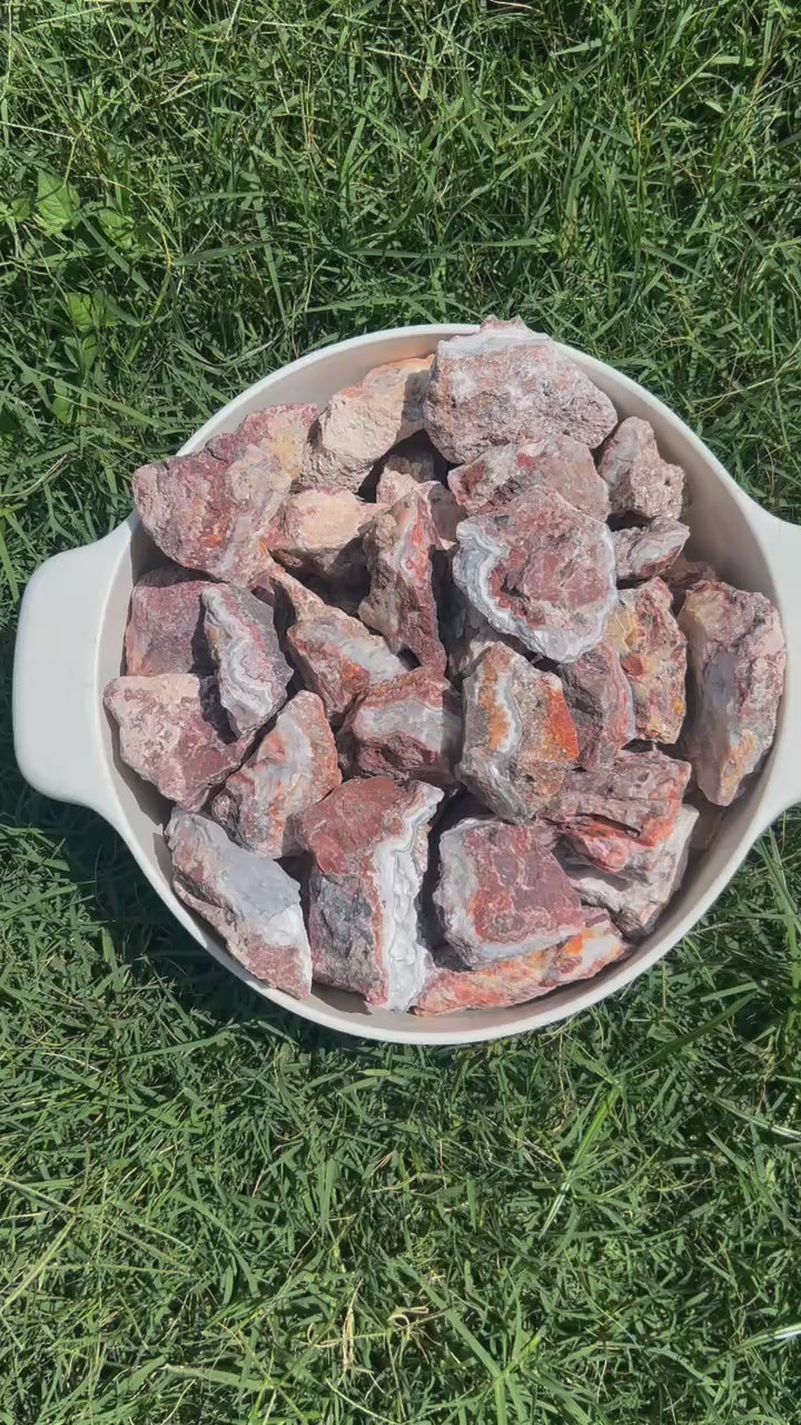 Lace Agate varieties from Chihuahua, Mexico are famous for the intricate banding and deep red color. These beautiful lace agates are from a crazy lace agate vein but have a slightly different pattern that more closely resembles a Laguna Lace Agate (deep red). There will be some "crazy" lacing on pieces and also some cascading/ornamental peaks as well. These are great stones for a large tumbler or lapidary work (cabochons). Use the dropdown to select either 1 piece, 1 LB or 3 LBs of rough Mexican Lace Agate.
