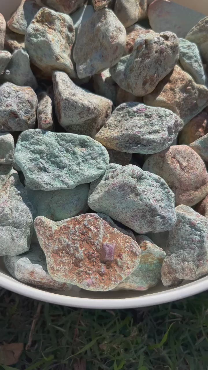 Use the drop-down to select either 1 stone, 1/2 Pound, 1 Pound or 3 Pounds of raw Ruby Fuchsite! Also known as Ruby in Chrome Mica, "Tanganyika Artstone" or "Corrundum in Fuchsite". This is a metamorphic rock with green fuchsite and corrundum (ruby).