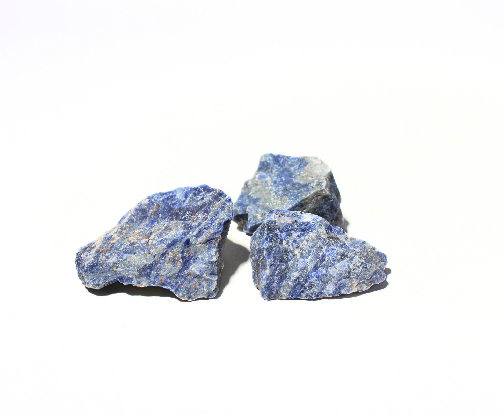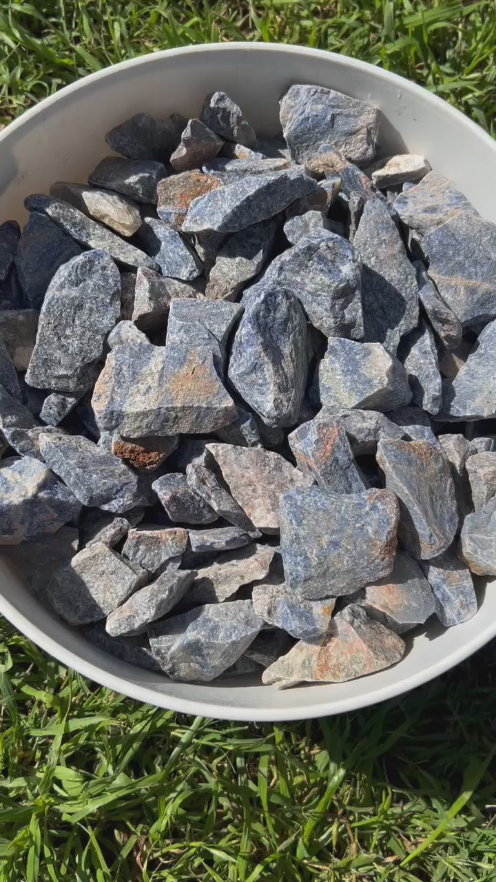 These sodalite rough rocks have a combination of color hues: dark blue, grey, and white. The intersection creates nice contrast with a few pieces showing some banding-like lines. These crushed rock pieces are perfect for rock tumbling enthusiasts, rock collectors or home decor. They also run long and more flat that would work for slabbing or cabochons. Use the dropdown to select either 1/2 LB, 1 LB or 3 LBs of rough Sodalite.