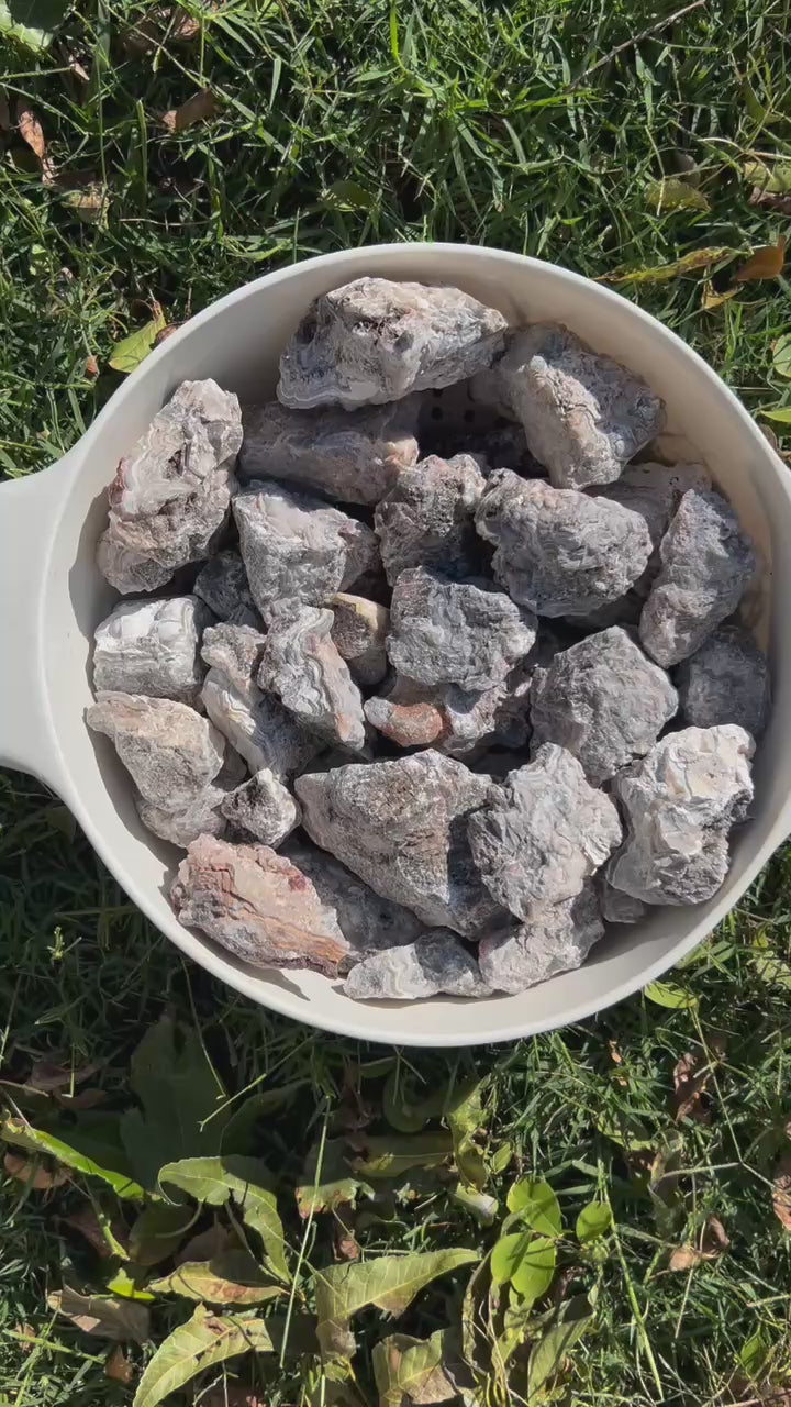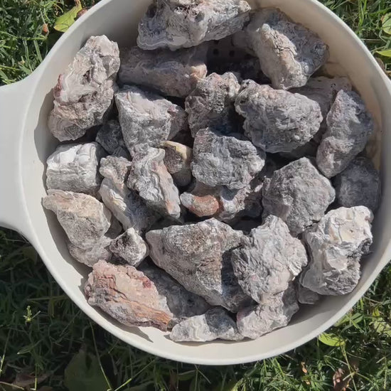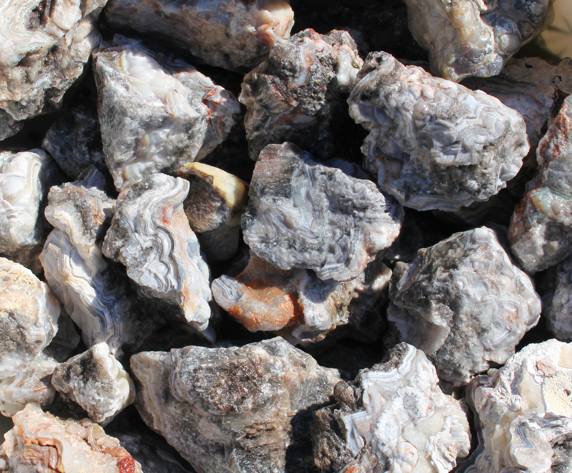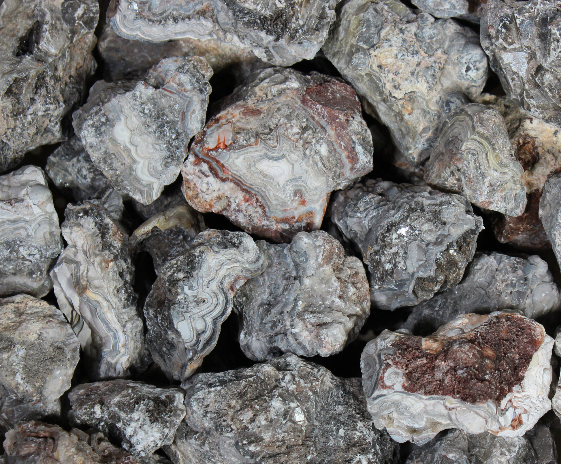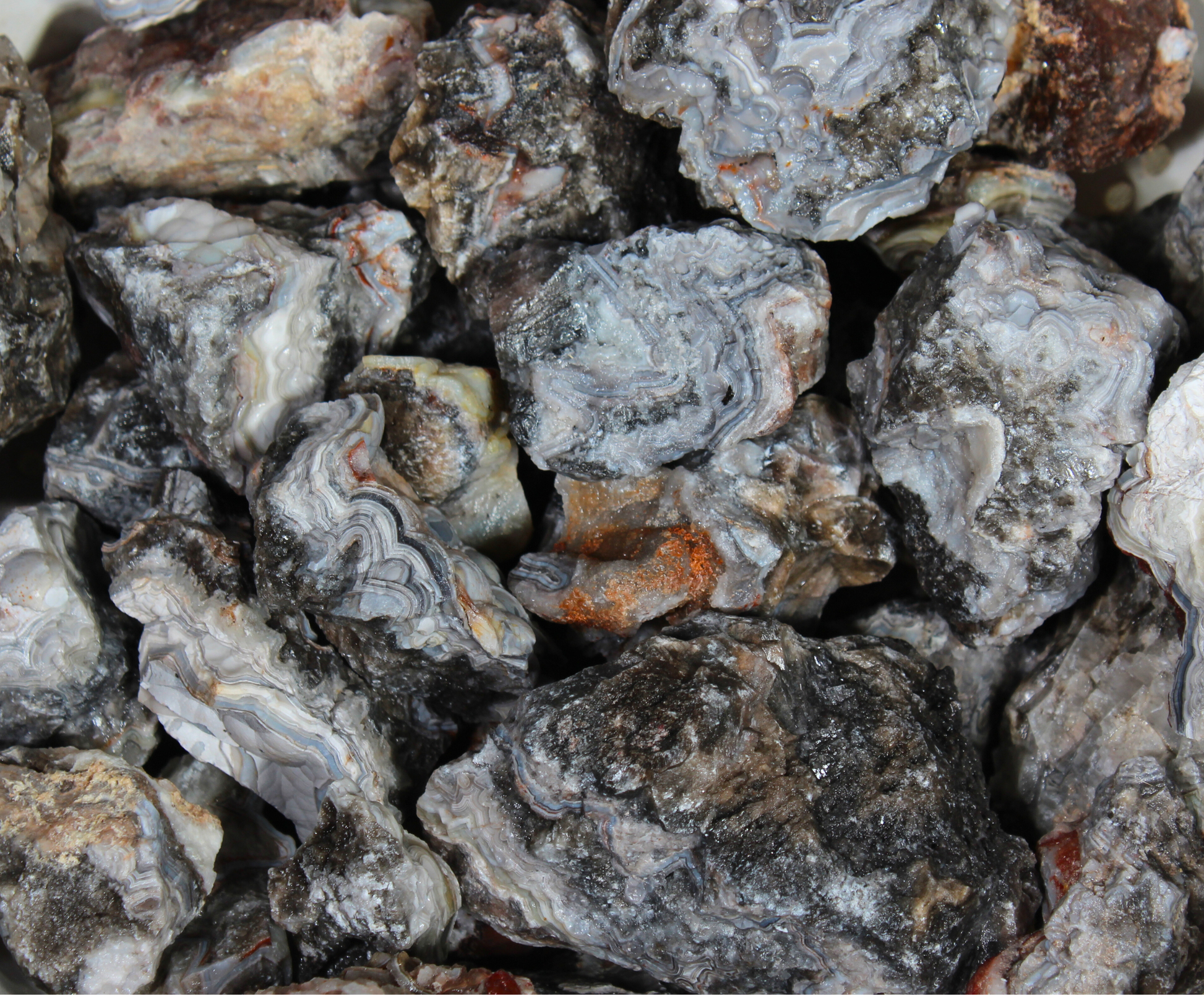 These rare Tuxedo Lace Agate come from Chihuahua, Mexico (Benito Juarez) and have very unique black and white lacing pattern. The pattern can be crazy or concentric, depending on the piece. The host rock will also have dark druzy quartz, creating a nice contrast of material to work with. This rough rock is perfect for cutting/slabbing for cabochons and will take a very nice polish. We offer these by 1/2 LB, 1 LB or 3 LBs.