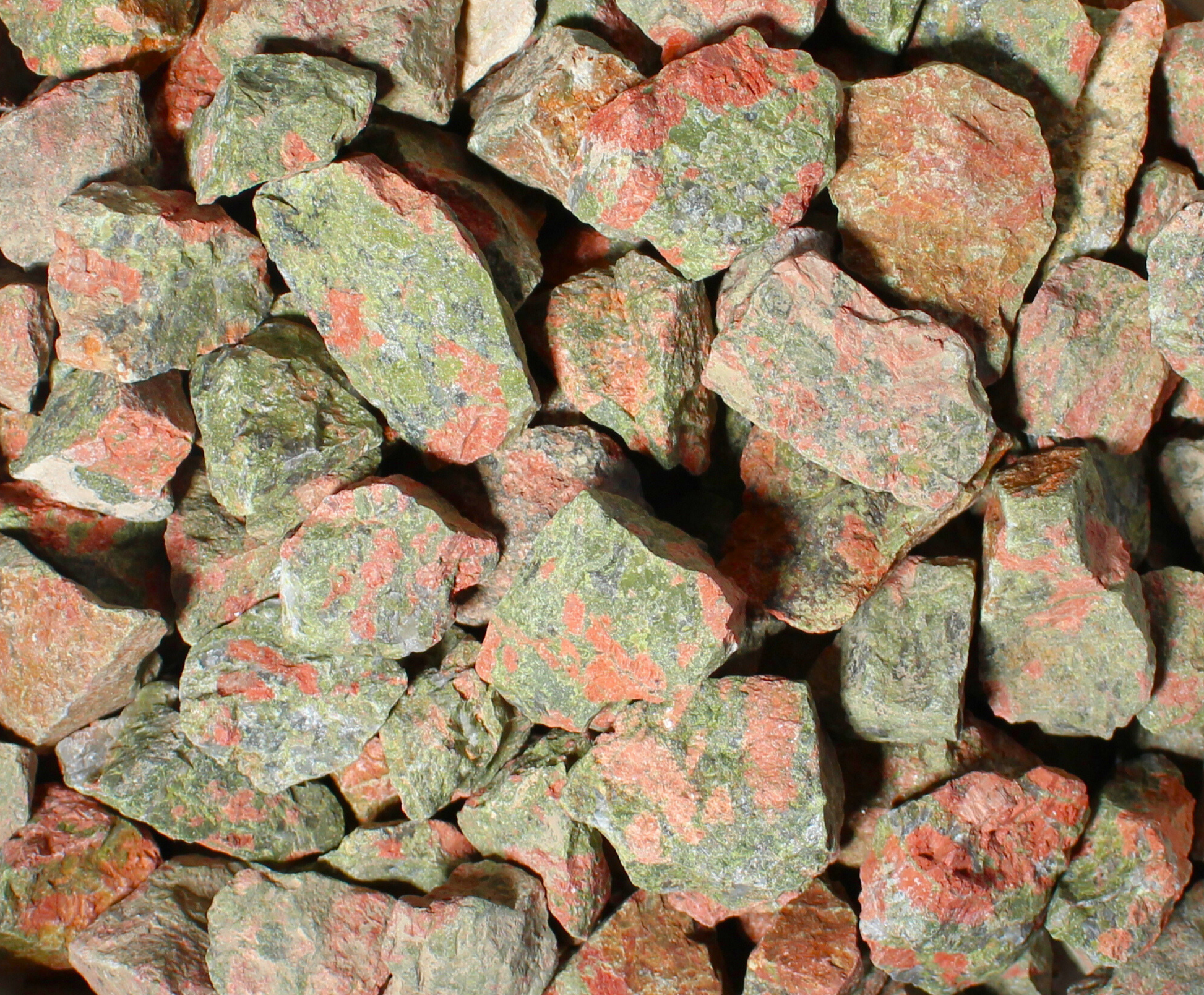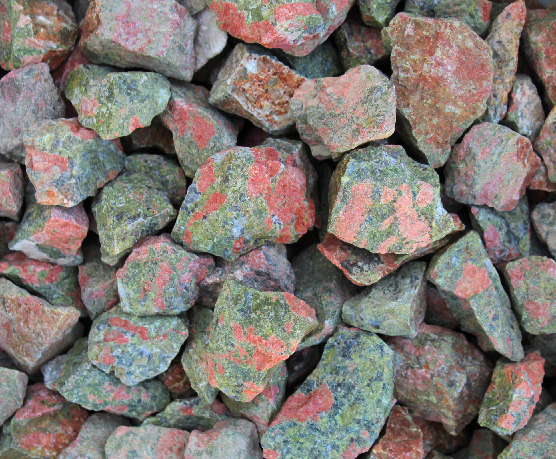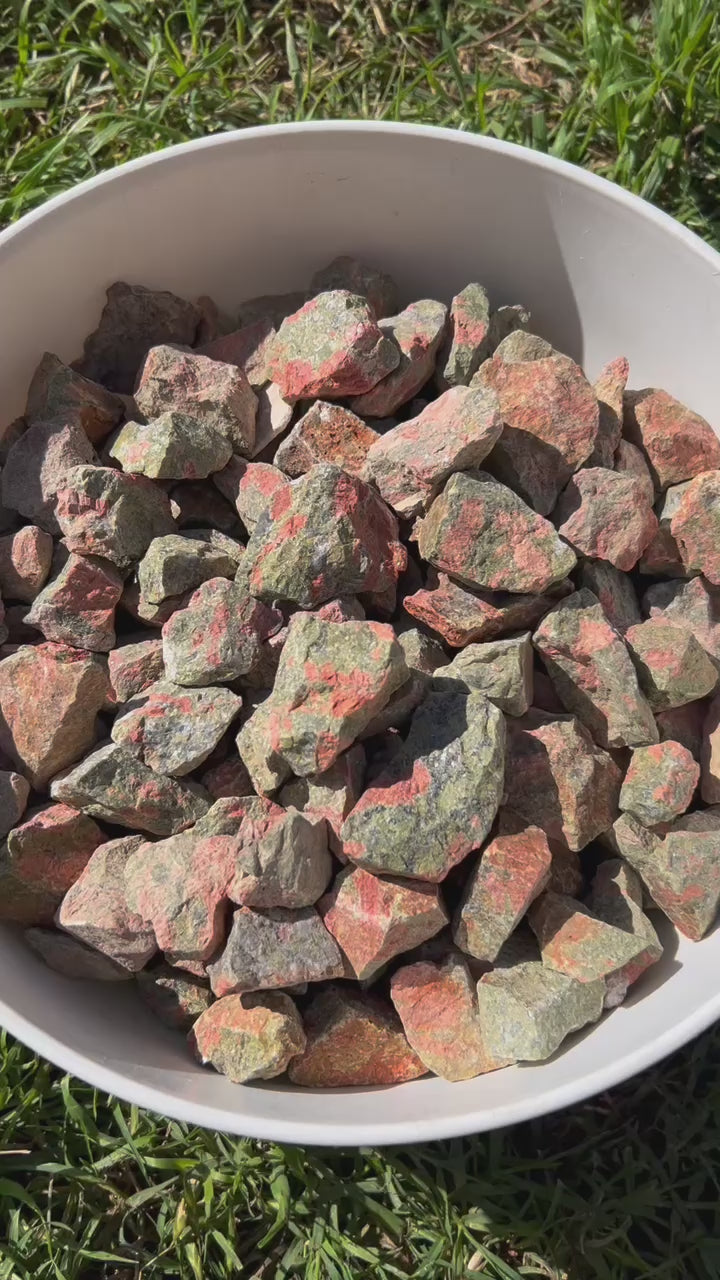 These Unakite rough rocks have a combination of color hues: Light Green and Pinkish-Red (green is epidote and the Pink-ish Red is orthoclase feldspar). This metamorphic rock was originally discovered in the United State but is prolific in mines around the world. These crushed rock pieces are perfect for rock tumbling enthusiasts, rock collectors or home decor. Use the dropdown to select either 1 piece, 1/2 LB, 1 LB, 3 LBs or 5 LBs of rough Unakite.